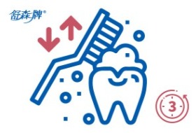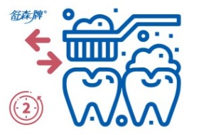 【說明】從牙齒的正面上排,下排,及背面的上排、下排,後臼齒、咬合面、牙縫、牙齦溝來回塗刷至起泡,很多人刷牙時間太短,牙膏尚未融化,未開始發揮清潔作用,就漱口了,牙齒怎能刷得乾淨呢?